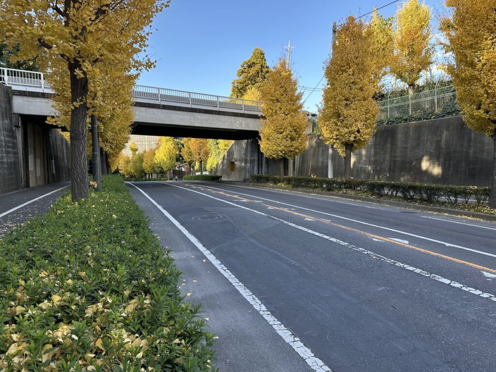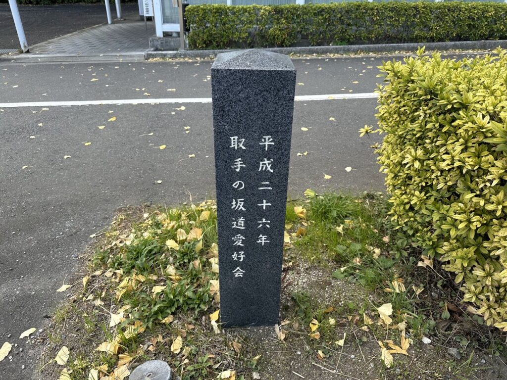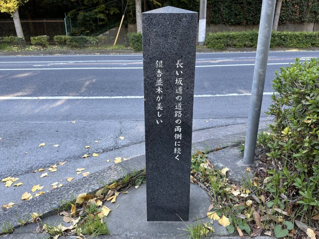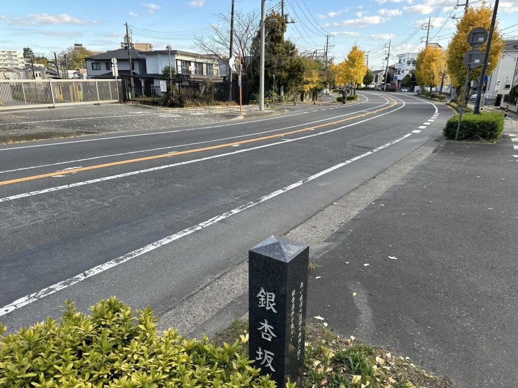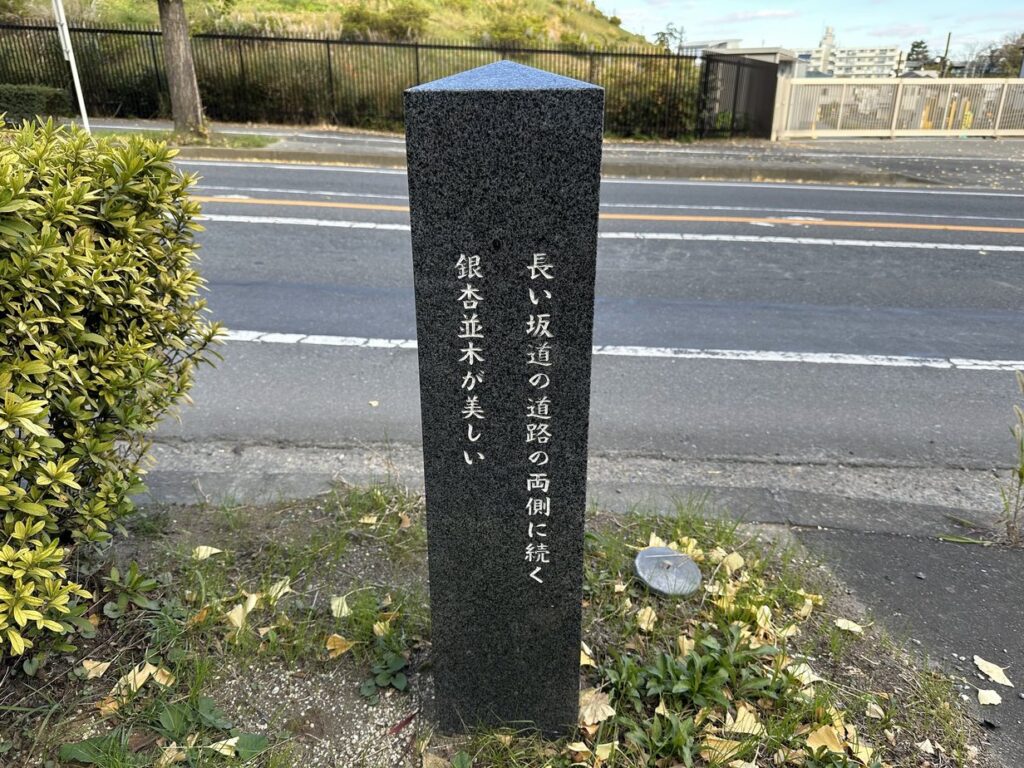 2025.11.22 陸橋を頂点に、南北に下っている坂。取手の坂道愛好会が、その両端の坂下に坂標を建立したのだろう。常総ふれあい道路の最も銀杏が美しい坂を選んで、名付けたので、このような坂になったようである。取手ライオンズクラブの協力で、立派な石碑が建てられている。