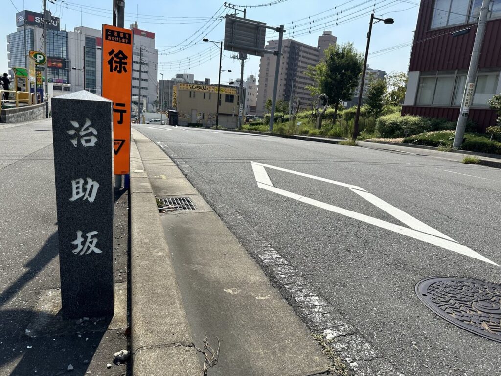 坂上には、両側の歩道に、同じ石碑の坂標がある。