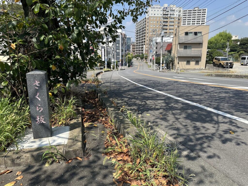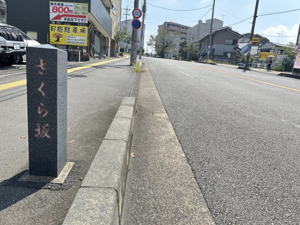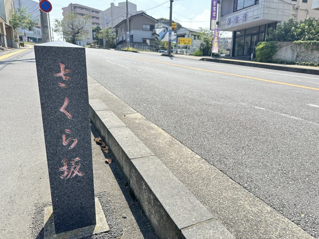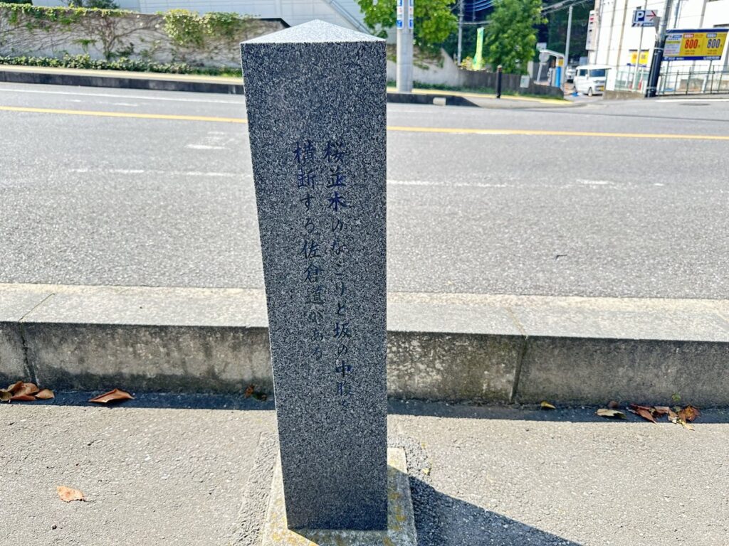 2024.9.7 さくら坂 桜並木のなごりと坂の中腹を横断する佐倉道がある。平成十九年 取手の坂道愛好会 取手ライオンズクラブ