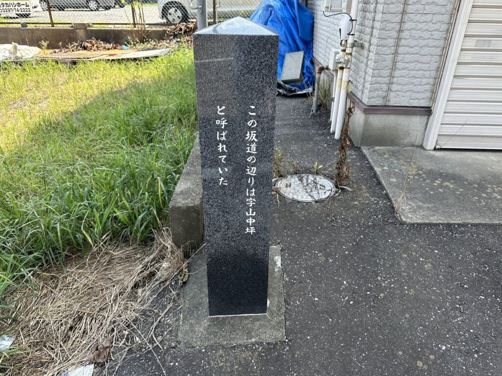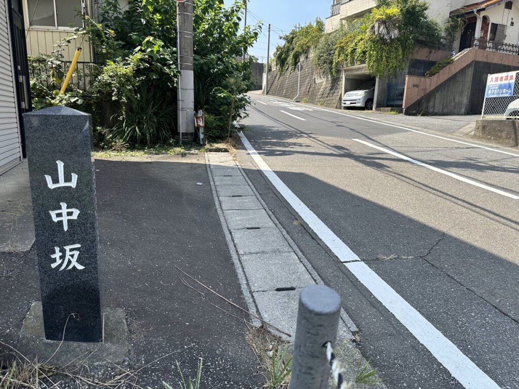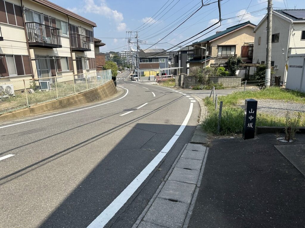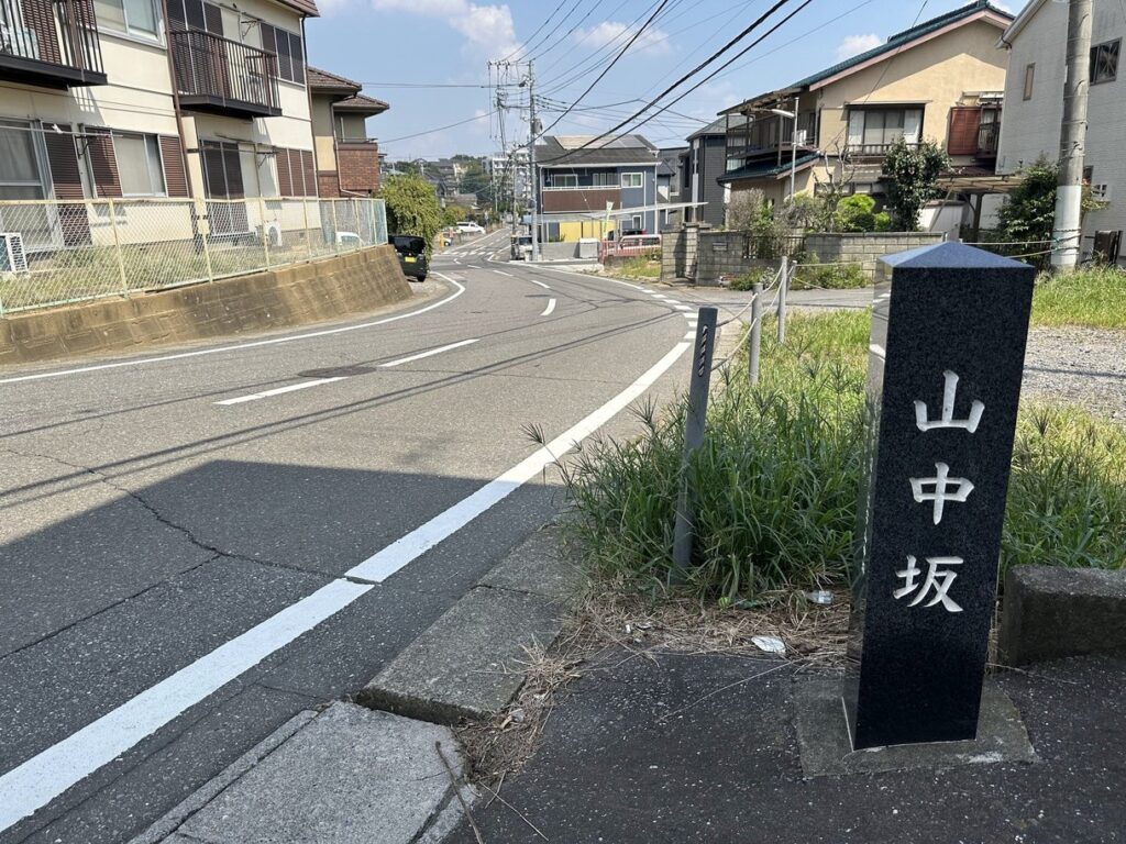 2024.9.7 山中坂 この辺りは三方を山に囲まれた地形から『三渓望』とも云われ、この辺りの地名がかつて『字山中坪』であったことから命名した。取手の坂道愛好会