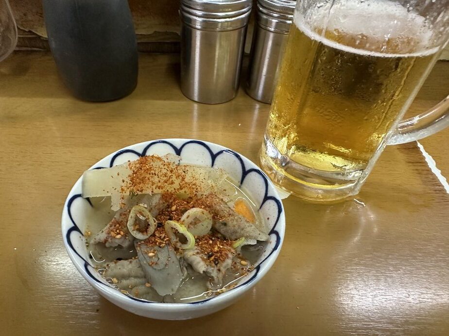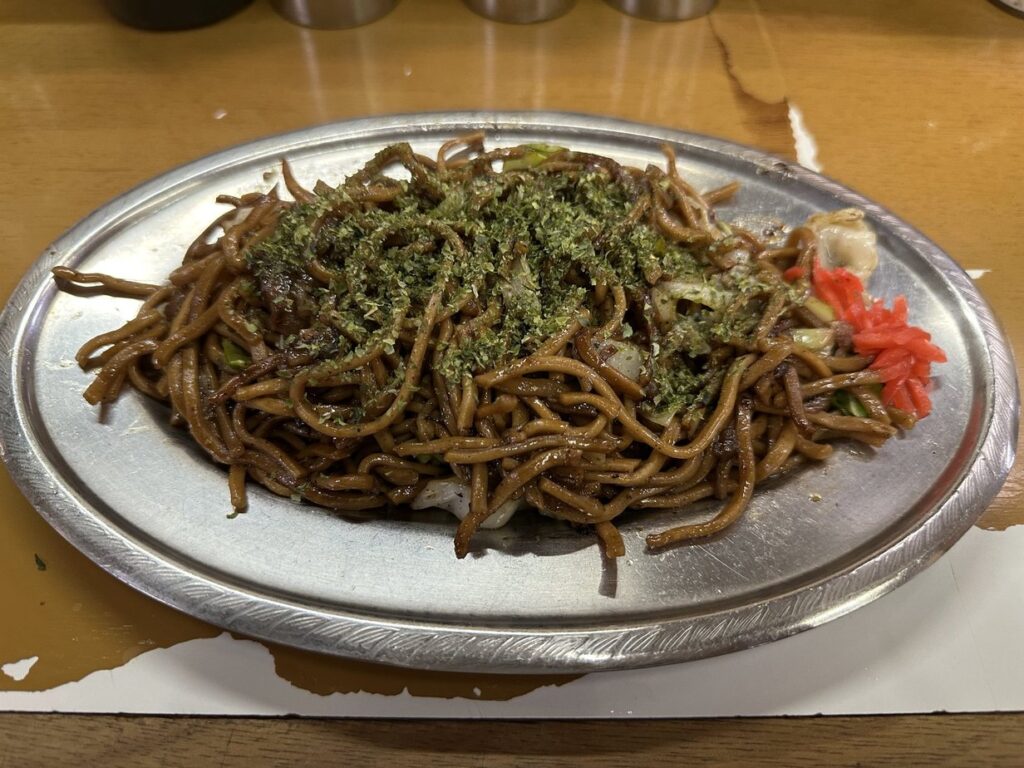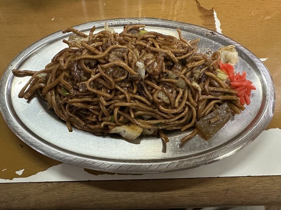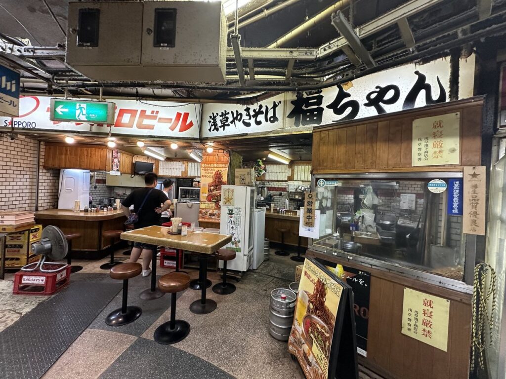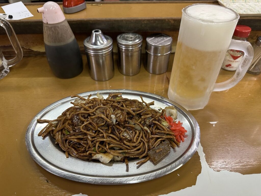 上野の国立博物館平成館のに、蔦谷重三郎展を見に行った帰りに、浅草駅地下街のこのお店に寄ってきました。銀座線改札からすぐの場所に、オープンスペースのように店舗があります。カウンターメインの、テーブル席も少々。お昼過ぎなので、結構お客さんがいます。カウンター席のお客の荷物をどかしてもらい、そこに着席しました。頼んだのは、もつ煮込みです。料理と一緒に出してと、生ビールも注文しましたが、すぐ出ると思われたもつ煮込みが、なかなか出てきません。どうやら、温めができていなかったようで、他の客の注文が先にどんどん出てきました。ようやく提供されたもつ煮込みですが、牛蒡や人参、蒟蒻も入っていますが、肝心のもつは少なく、400円と安いだけあるメニューなのだと感じました。さて、メインの焼きそばは、迷いましたが、牛すじ焼きそばの大盛りをいただきました。これは、正解で、牛すじがつまみになりますし、焼きそばにコクをプラスしているようです。屋台の焼きそばと同様、いっぺんに大量の麺をソースで炒めて、注文が入ると、牛すじを足して炒め直すというスタイルですが、炒め加減もソースの味もすばらしい一品でした。次は、目玉焼きトッピングの大盛りと、今度は牛すじ煮込みを注文しましょう。近くにあれば、通いたい店です。生ビールが400円なので。ありがたいことです。