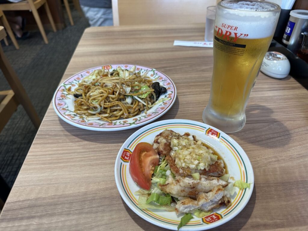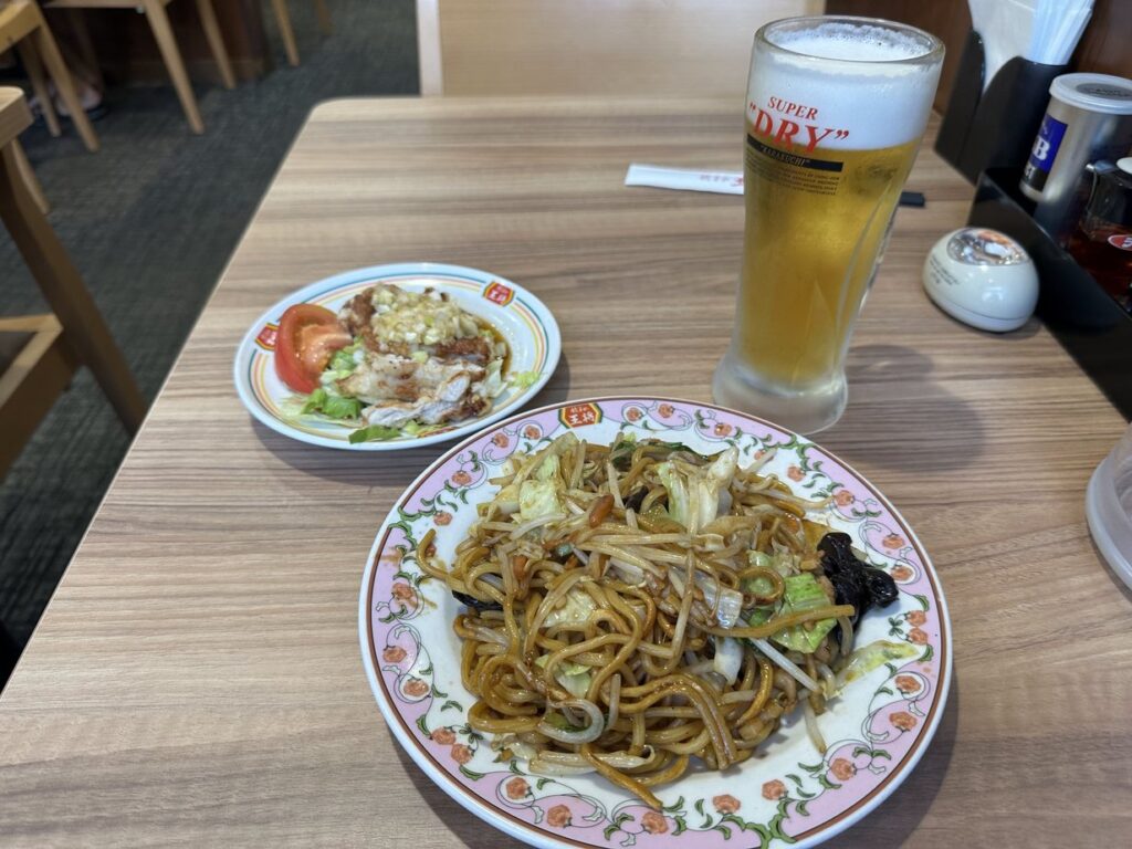 今回は、三ちゃん食堂がお盆で休みだったので、こちらへ来訪。お昼時でしたが、タイミングがよく、少々待つと、いつもの、端っこのテーブル席へ。やはりここが落ち着きます。焼きそばは、旨い方のソースで、あとは、ジャストサイズの恒例、にんにく激増しぎょうざと、未食の油林鶏を注文しました。焼きそばが一番に出でてきて、油林鶏が次に。油林鶏は、酸味が利いていて美味しいです。ビールに合います。ホルモン炒めより、中華っぽいです。最後に餃子ですが、焼きたてではないのはなぜでしょう。焼いてあるなら、すぐに出して欲しいです。つまみ三品ですから、生ビールはおかわりを2回です。生ビールは、おかわりの方が、撮影時間を置かないので、冷たくて旨いです。次は、炒飯もいきましょうか。