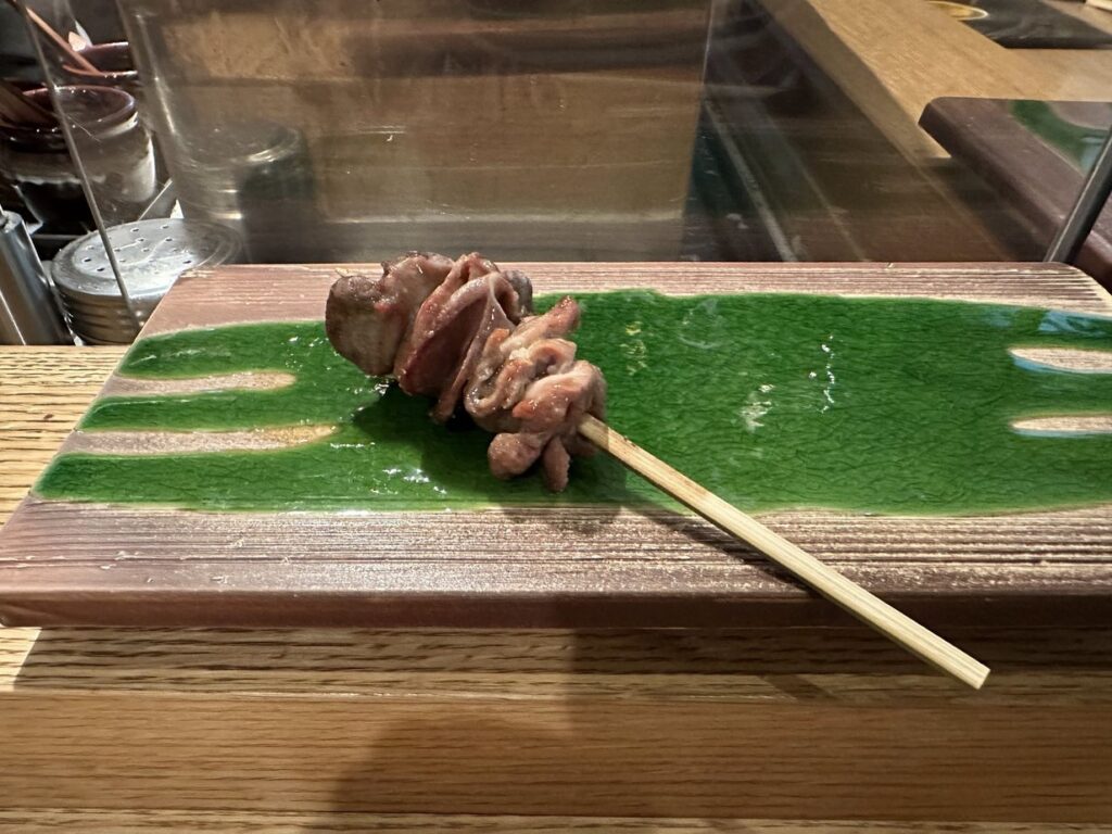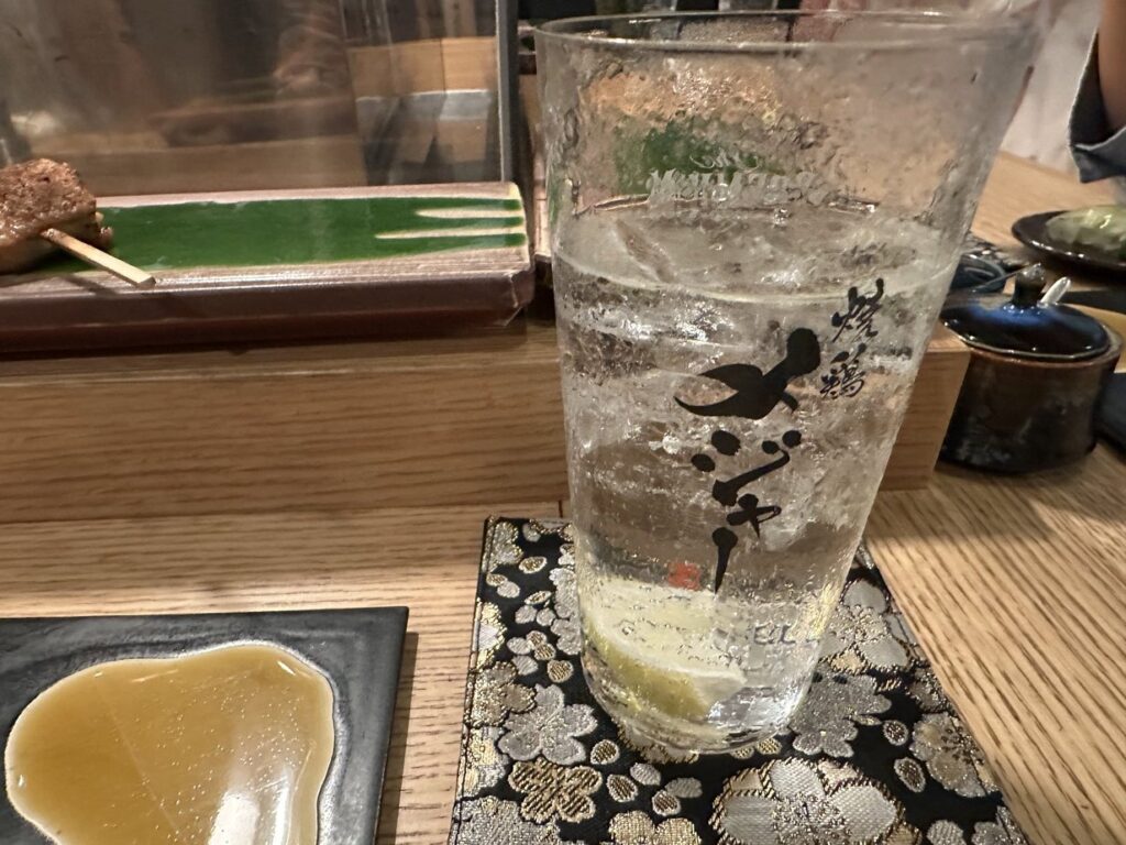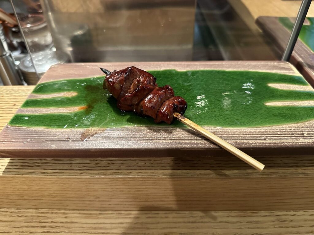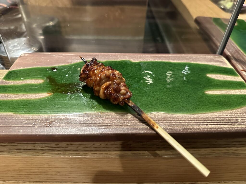 Makuakeの予約。坂学会の飲み友の一人と、錦糸町の焼鳥屋へ。錦糸町とは思えない、小さいながらも、焼鳥屋ならぬ小綺麗なお店です。小さい店内は、コの字のカウンターに9席と、テーブル1卓の4席です。我々は、唯一のおじさん二人組なので、角を挟んでカウンターに着席を指示されたのでした。確かに後から来た客は、3組とも若いカップルで、これも焼鳥屋らしからぬ感じでした。本日は、ジビエバーガー付きの飲み放題付きコース、¥10,000。酷暑の中ですから、乾杯は生ビール。メニューにプレモルとマスタードリームが書かいてあったので、プレモルを頼むと、若い女性の店員が困った顔で、その後男性の店員が登場して、プレモルとマスタードリームは同じものですという説明が・・・。ならば、二段に書かずに、一行で書けばと思った次第です。プレモルは3種あるのだから、わかるようにお願いします。さて、はじめに出てきたのは、玉蜀黍のすり流し、蝦夷鹿たたき山わさび、大間の鮪の前菜でした。温かいすり流しも甘くてよいです。鮪のとろは筋が気になりました。面白いのは、自ら刷毛で醤油を塗っていただく趣向です。たたきは、山わさびを忘れたのかと思うくらい利いていません。さて、メインの焼鳥は、塩が多く、鶏肉の旨味を引き出す焼きは上手でした。焼きながら焦げはさみで切り取って成形しています。笹身と唐墨の磯辺焼きが一番でしたか。野菜串、特に旬のズッキーニが旨かったです。茄子は味がちょい足らないようで。飲み放題ですが、後半は、檸檬サワーをいただきました。どこぞと違って、焼鳥には、ガブガブ飲める酒がいいですね。食事の、蝦夷鹿のバーガーは、旗が今どきですが、見た目ほどはパンチはなく、普通に旨いものでした。TKGは、卵がメインのようで、そぼろ付けますかと聞かれます。もちろんお願いしました。ないとどういう感じか気になりましたが、薄味のそぼろも、卵を打ち消していないので、やっぱりそぼろ付きが正解かと思います。鶏スープは、すっきりとしていて鶏の香りがあり、定番ながらよかったです。シャーベットで口直しで終了。一万円なら、満足のコースかと、納得させられる仕立てでした。まあ、もう一度行ってもよいお店です。