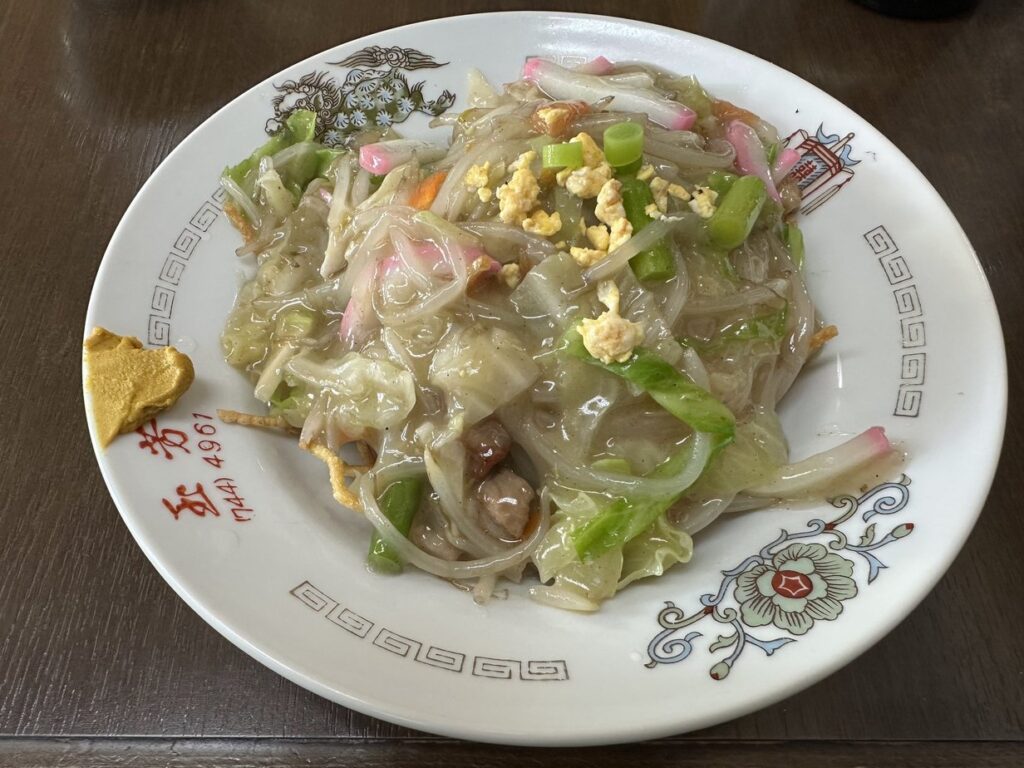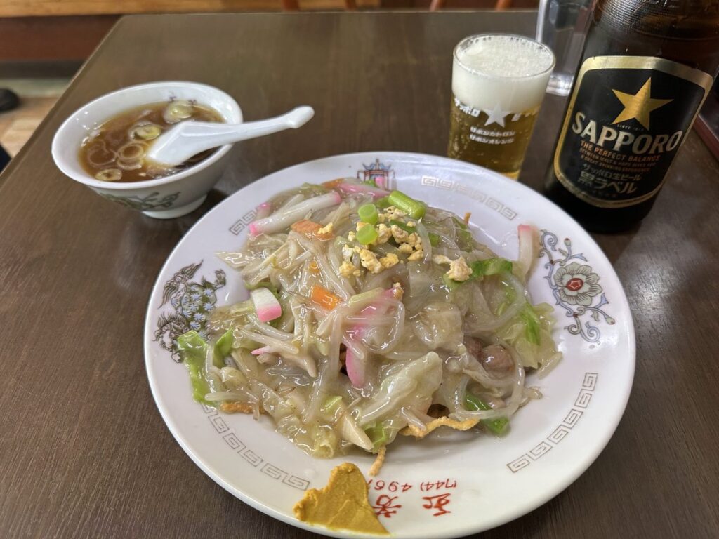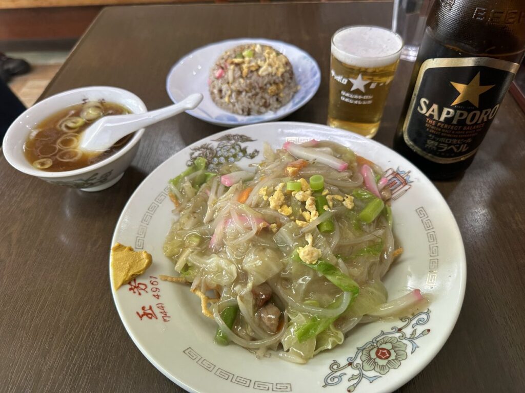 京急線大鳥居駅そばの町中華の店で、5度目のランチビールです。今回は、ヤキソバに戻って、揚げヤキソバを、半炒飯と一緒にいただきました。ビールはやはり生がないので、また、サッポロ黒ラベルの中瓶を頼みました。食事と一緒の提供を忘れずにお願いしました。今回も奥のテーブル席へ。揚げヤキソバは、やはり焼きそば感がなく、あんかけは炒め焼きそばとは別物でした。炒飯は、相変わらず旨くて、この店の一番ですね。